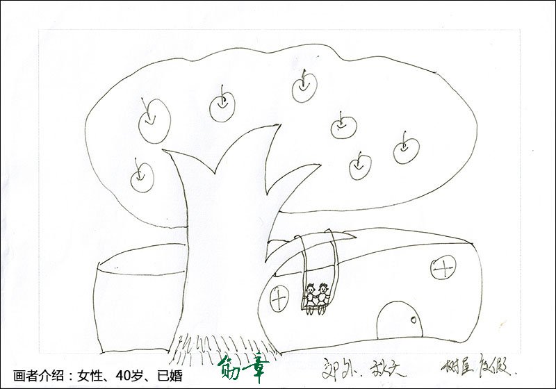 这是一幅房屋主题画,画面最吸引眼球的是那棵硕果累累、茂盛的苹果树,而且画者作画时,先画树然后才在空白处画房屋,表达了画者在家庭与事业两方面她更关注个人事业;扎实稳固的根基,粗壮有力的树干,表达了她在事业中的努力与成就;宽阔伸展的树冠,简洁柔顺的线条,表达了她人际互动的关怀友善。