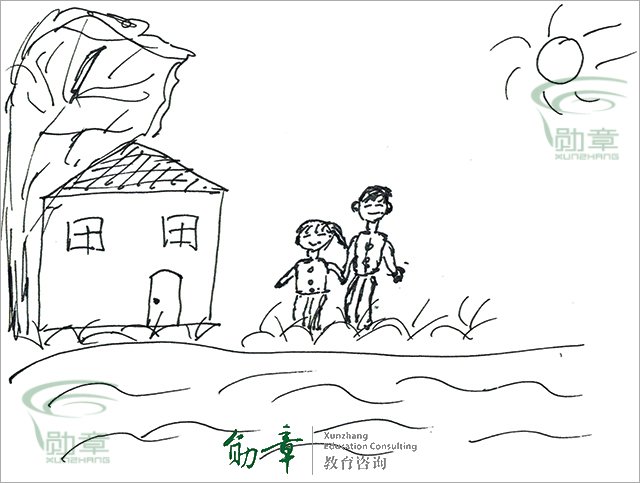 创作画除了“房、树、人”主要元素外,画者添加了河流、草地和太阳。宽大湍急的河流横亘面前,挡住去路,波浪起伏丛生的杂草,淹没了行路人的脚步,一轮太阳高挂天边,象征画者面临困境和生活波折时,常常意志不坚,需要有强势的伙伴依赖,以导师的作用为她指点迷津,引导她上进前行。