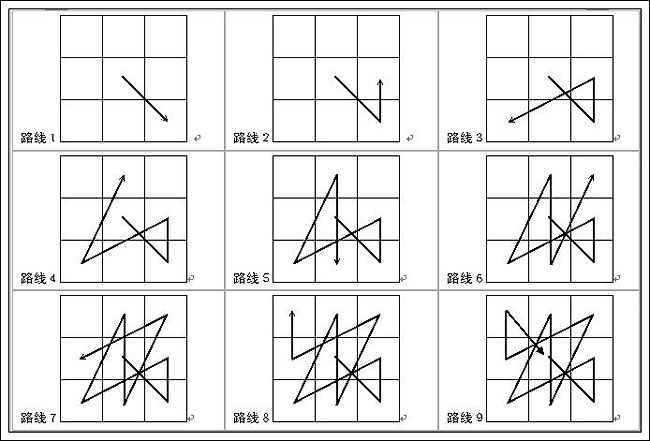 按照此飞星顺序,我们将一至九分别代入中宫,制成下表,以供对照: