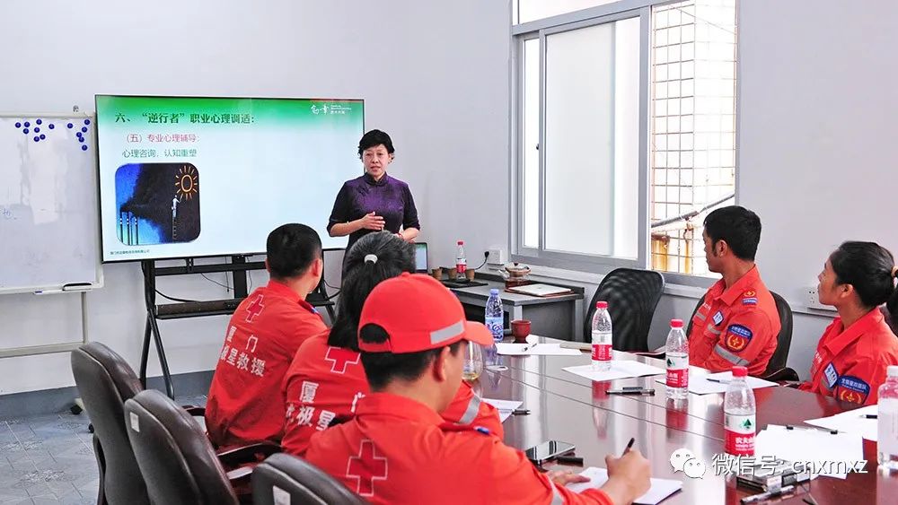 2023年11月11日,厦门市红十字会心理援助志愿服务队专业心理老师受邀走进北极星援助队基地, 为北极星援助队队员开展“逆行者职业心理调适”培训。培训从内心世界构成要素导入,通过图文并茂、现场体验、观看视频、分享互动等多种形式,将深奥抽象的心理学理论,让大家理解把握,并领悟其中精髓,同时和自己的工作、生活、家庭实践相关联。